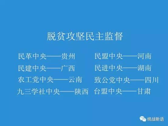 就脱贫攻坚开展民主监督,是党中央赋予统一战线的新任务,是拓宽民主监督渠道的有益尝试,对打赢脱贫攻坚战、彰显多党合作的制度优势意义重大。2016年以来,8个民主党派对口贵州、河南、广西、湖南、云南、四川、陕西、甘肃8个省区开展脱贫攻坚民主监督,主要就贫困人口精准识别情况、贫困人口精准脱贫情况、贫困县摘帽情况、落实脱贫攻坚责任制情况、重大政策措施执行情况、扶贫资金项目管理使用情况等开展民主监督。通过广泛深入地进行实地调研,举行各种座谈、协商和沟通,脱贫攻坚民主监督工作取得了重要阶段性成果。
